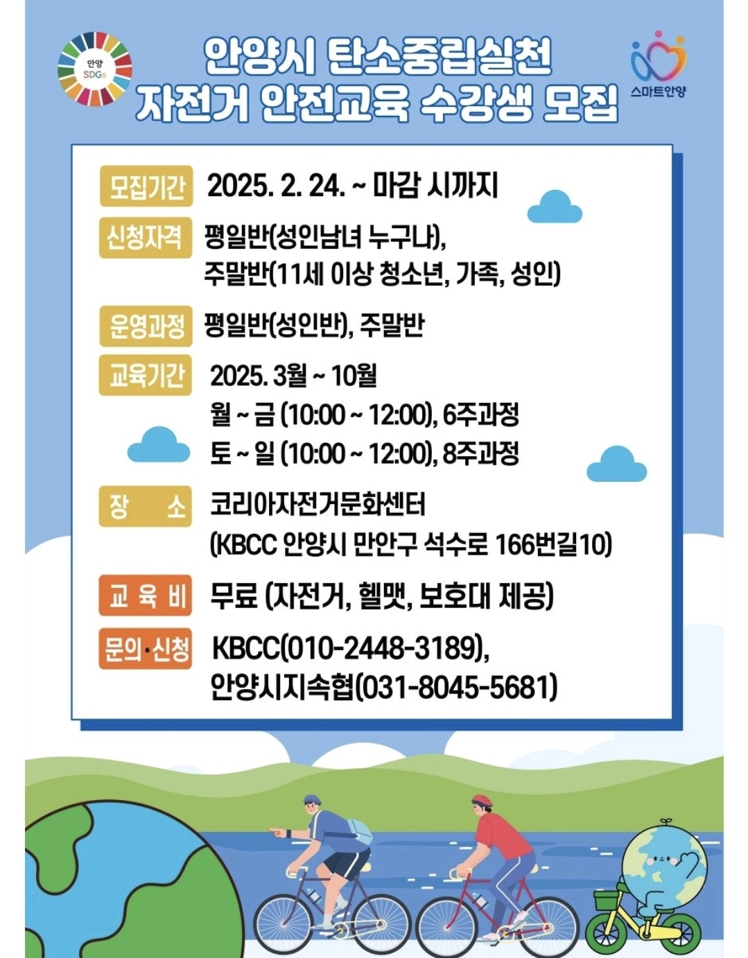 안양시는 자전거 안전문화 확산과 시민 건강 증진을 위해 매년 무료 자전거 교육을 실시하고 있습니다.