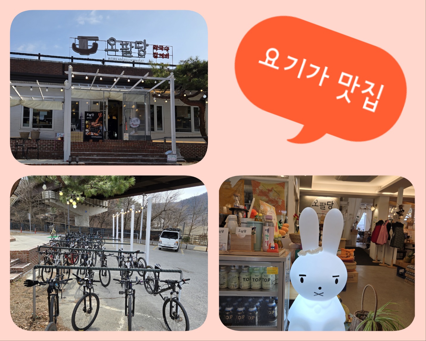 광나루에서 출발해 남한강 자전거길을 따라가면 팔당대교를 지나게 됩니다. 강을 가로지르는 이 다리를 건너면 더욱 시원한 풍경이 펼쳐지죠. 오팔당이라는 곳에서 따뜻한 곰국과 이 식당의 시그니처 메뉴중 하나인 들기름 메밀국수가 너무 맛나서 좋은 날에 또 가야겠습니다.